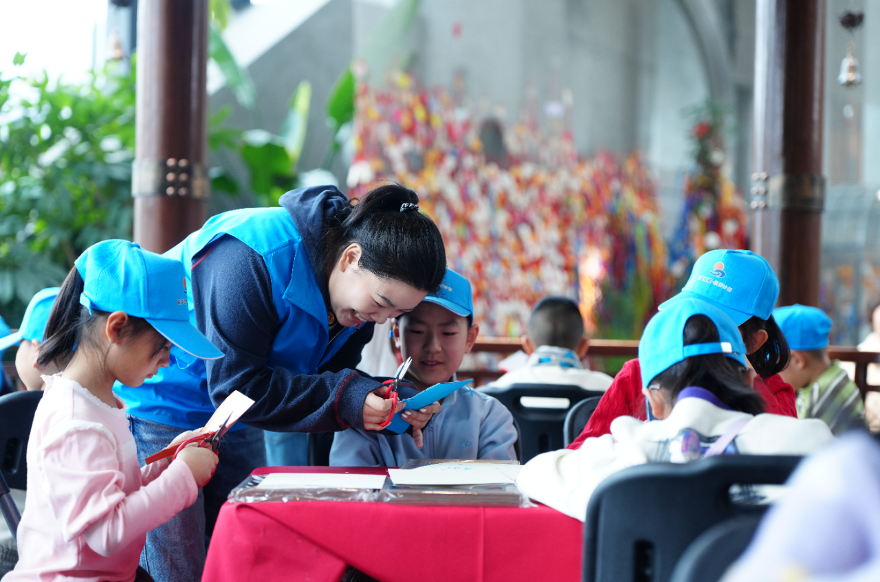移步望山亭,非遗手作课堂成为本次研学的精彩亮点。“北国灵韵・吉剪乡情”非遗剪纸体验课上,专业老师手把手教学,孩子们一边欣赏错落有致的山景,一边动手体验剪纸技艺,指尖翻飞间,一张张普通的红纸变成了精巧的剪纸作品,孩子们不仅感受到传统手工艺的精妙,更将这份美好亲手收藏,完成作品的同时,一张张笑脸在山景映衬下格外灿烂。