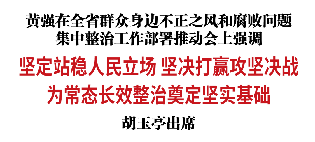 胡玉亭指出,要按照党中央部署持续强化正风肃纪反腐,常态化整治群众身边不正之风和腐败问题。要严肃财经纪律,加强资金监管,严厉打击违规违法行为,确保公共资金资产安全高效使用。要紧盯高标准农田建设和就业、社保、医疗等重点领域,归集重点问题、形成负面清单,持续加大整治力度,逐个销号清账。要将集中整治与深化改革、完善制度、提升治理能力结合起来,持续巩固拓展成果,防止问题反弹回潮。各级领导干部要提高风险辨识能力,履行好“一岗双责”,落实好“管行业必须管行风”要求,将集中整治与年度重点任务同谋划、同部署、同推进,进一步提高治理效能。