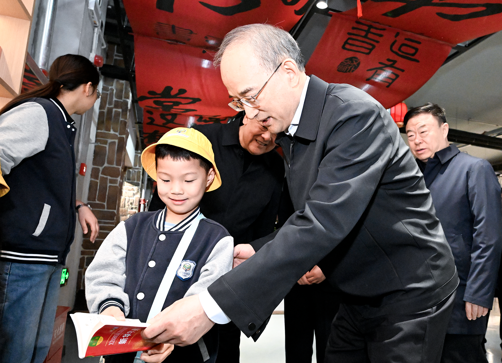 4月13日,省委书记黄强在长春调研,在“这有书”书店与正在研学的幼儿园小朋友一起查字典、找“吉”字。