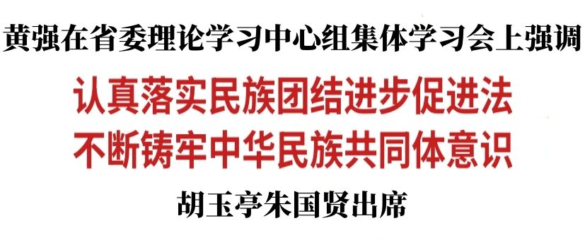 4月23日,省委书记黄强主持召开省委理论学习中心组集体学习会。他强调,要深入学习贯彻习近平总书记关于加强和改进民族工作的重要思想,认真落实民族团结进步促进法,不断铸牢中华民族共同体意识,进一步巩固全省各族人民团结奋斗的共同思想政治基础。省委副书记、省长胡玉亭,省政协主席朱国贤出席会议。