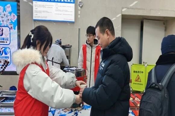 团白城市委于火车站设置“暖冬驿站”,除了提供红糖姜水、暖贴等御寒物资之外,还新增了“充电休息区”与“母婴关爱角”,配备了充电设备、婴儿护理台等便民设施,服务细节更显人性化。