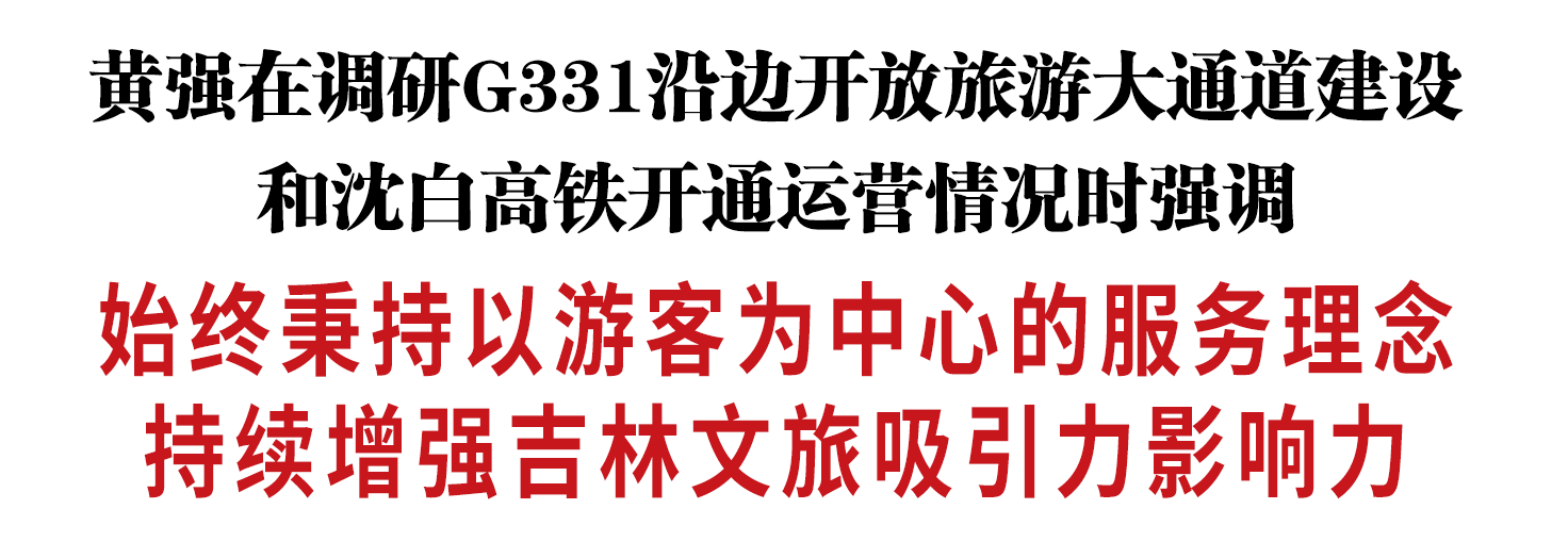 9月28日,省委书记黄强到长白山保护开发区和白山市抚松县,调研G331沿边开放旅游大通道建设和沈白高铁开通运营情况。他强调,要紧紧把握住“双线”开通带来的重大机遇,始终秉持以游客为中心的服务理念,努力让游客享受到最优美的风景、最暖心的服务,持续增强吉林文旅吸引力、影响力。
