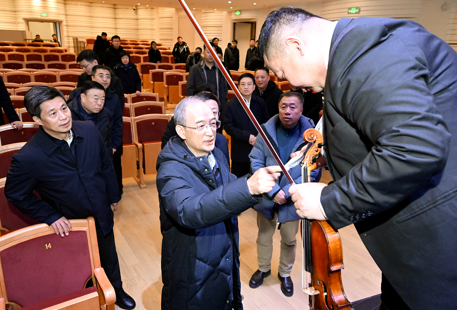 12月6日,省委书记黄强到长春丰乐剧场旧址调研,与省交响乐团成员亲切交流。