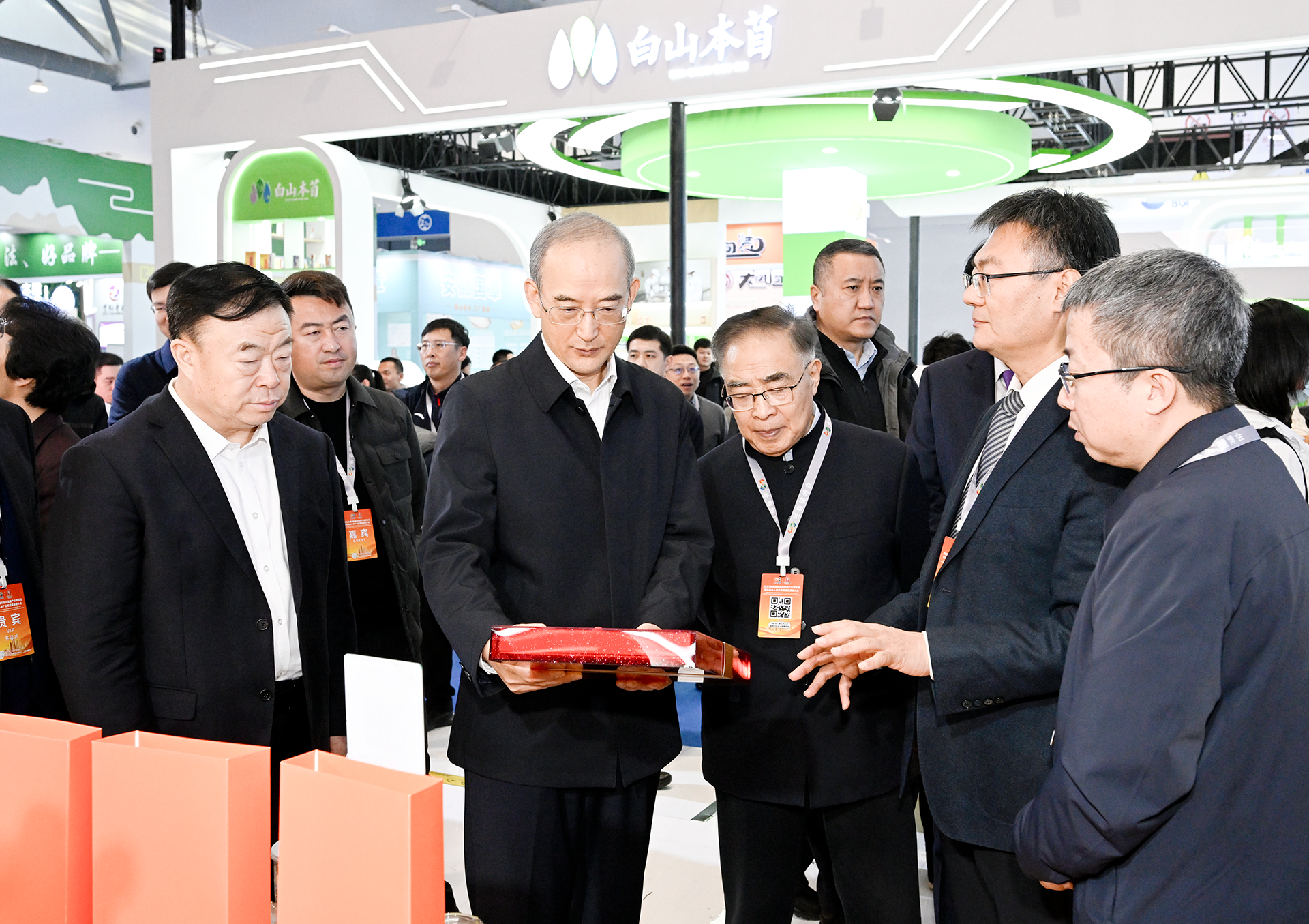 本届长春健博会设3大展区、10个主题馆、4个分会场,举办6大类30项活动,共有534户企业参加展览,其中世界500强、中国500强及上市公司达147家,吸引33个国家和地区企业、7个国际展团参展参会。上营野山参博物馆展出许多百年以上的野山参,特别是几株“参王”格外引人瞩目。黄强详细了解长白山野山参采挖、药用、加工等情况。他强调,人参是“百草之王”,是吉林千年的“金字招牌”,长白山野山参更是参中珍品。要大力保护野山参种质资源,加强功效研究,维护好市场秩序。要讲好“参王”故事,积极宣传推广人参文化,不断提高长白山人参的品牌价值。“吉字号”精品馆重点展示人参、梅花鹿、林蛙、食(药)用菌最新科研成果和创新产品。黄强与参展企业负责人深入交流,叮嘱他们要视质量为生命,及时做好新产品临床验证,真正做到货真价实。